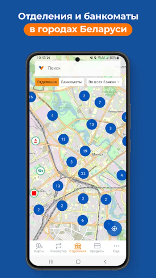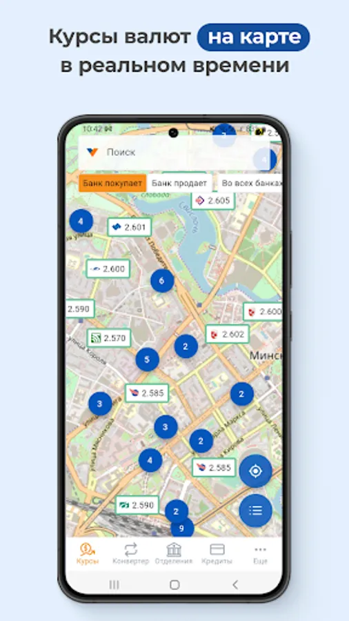 The application allows you to sort by the rate of selling or buying currency, by bank, by distance. Find the nearest branches, exchange offices and ATMs.