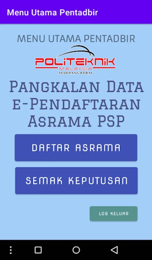 Bahagian pentadbir terdiri daripada pengurusan pangkalan data. Pangkalan data yang perlu dikendalikan adalah Pendaftaran Asrama dan Kajian Hasil.