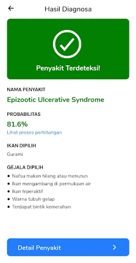 MyFishXpert is an application built specifically to help freshwater fish farmers diagnose diseases in fish they are cultivating easily and quickly. MyFishXpert also provides appropriate treatment recommendations and preventive measures to help fish farmers deal with fish disease problems more effectively. MyFishXpert has a user friendly interface, making it easy to use for all types of users. This application uses artificial intelligence technology, namely an expert system, to analyze the data provided and provide an accurate diagnosis of the possible disease that the fish is experiencing. The inference method used in this application is Forward Chaining with the Bayes Theorem being weighted. MyFishXpert is built using the React Native framework, while the database used is Firebase.