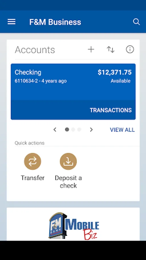 To use the F&M Bank MobileBiz! App, you must be enrolled as an F&M Bank Internet Banking user. If you currently use our Internet Banking, simply download the app, launch it, and login with the same Internet Banking credentials. After you successfully login to the app, your accounts and transactions will begin updating.