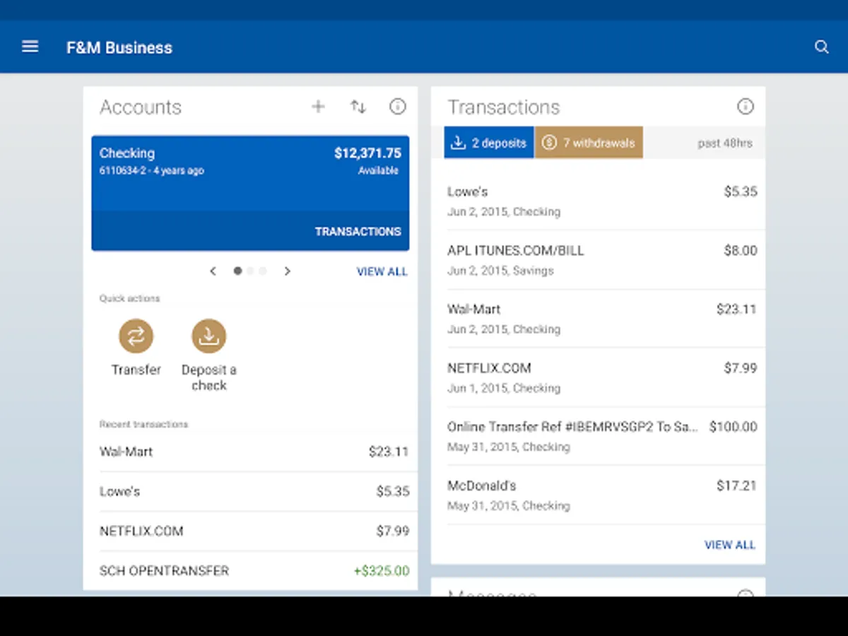 The F&M Bank Business App is a free mobile decision-support tool that gives you the ability to aggregate all of your financial accounts, including accounts from other financial institutions, into a single, up-to-the-minute view so you can stay organized and make smarter financial decisions. It is fast, secure and makes life easier by empowering you with the tools you need to manage your personal finances.