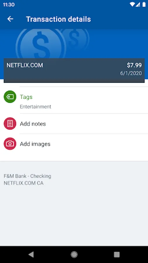 Add Tags, Notes, Images & Geo-Information: By enhancing transactions with custom tags, notes or photos of a receipt or check, you have the ability to stay organized and find exactly what you’re looking for when searching through your finances.