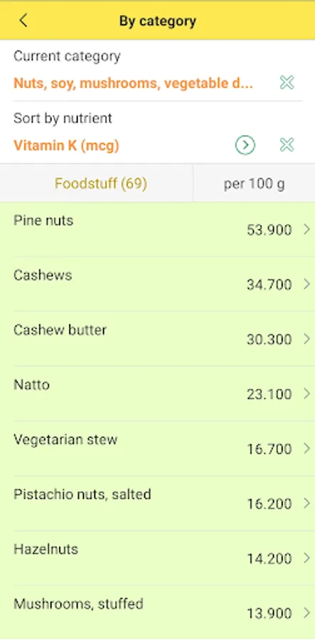 The program implements several methods for selecting products in an individual menu - by category and by the text in their names. You can also add products to your favorites for later quick access. Lists can be built with sorting by one specific selected nutrient. If you open the nutrient card, it will show twenty products with the maximum content.