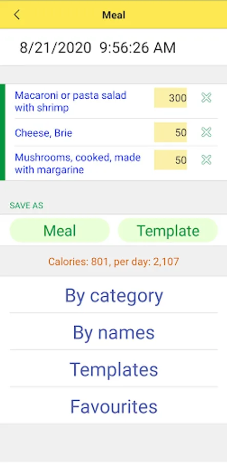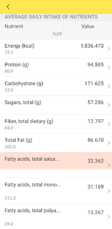 Information about the products consumed is stored for the last month, and during this period, you can build reports on the average daily intake of nutrients in comparison with established or recommended consumption standards for women and men.