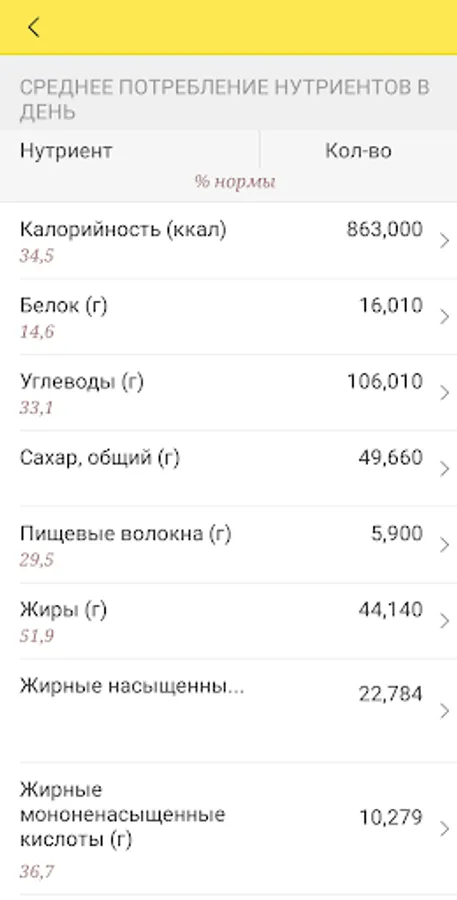 Information on consumed foods is stored for the last month, and during this period it is possible to build reports on the average daily intake of nutrients in comparison with the established or recommended intake rates for women and men. Children's norms are not included in the program, it is not intended for use by children.