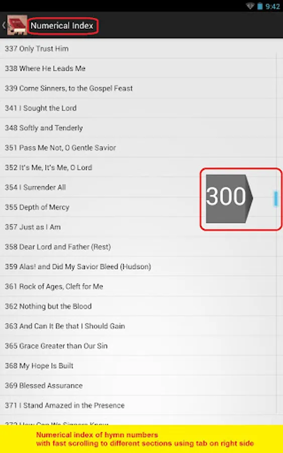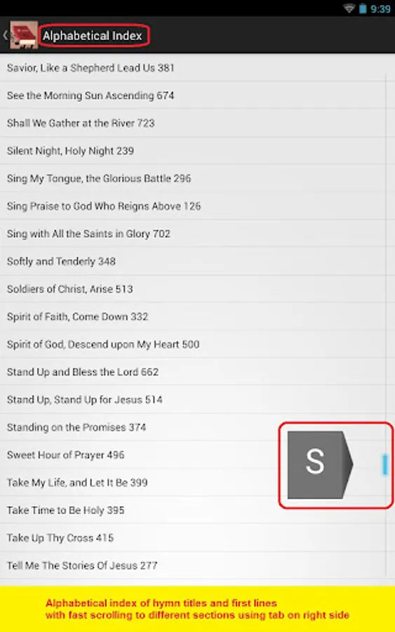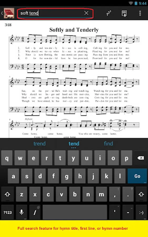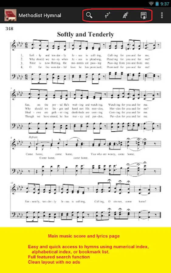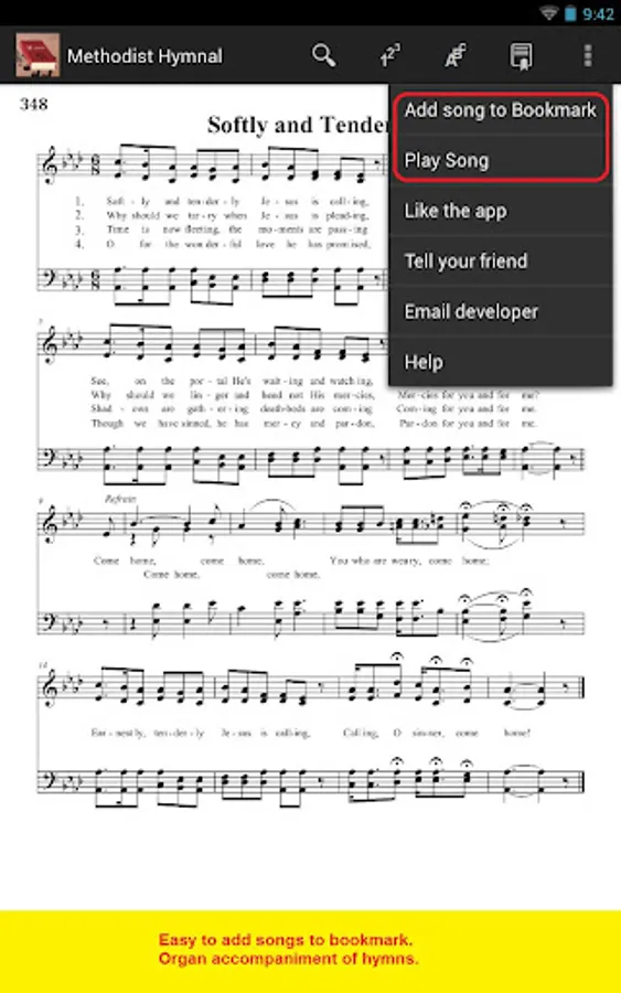 How wonderful and convenient to have your hymnal on your tablet. This is a full featured Methodist eHymnal with professionally typeset 4-part harmony music scores and lyrics. As a bonus, many of the hymns have professionally recorded organ accompaniment. Use the accompaniment for congregational singing, or to meditate on during your personal devotions.