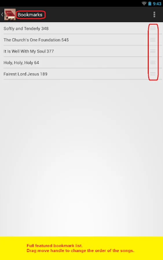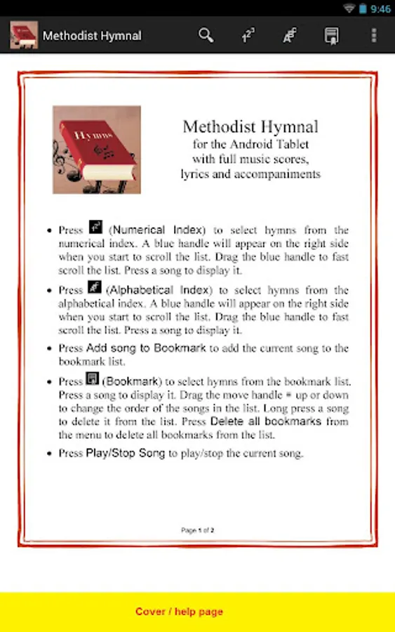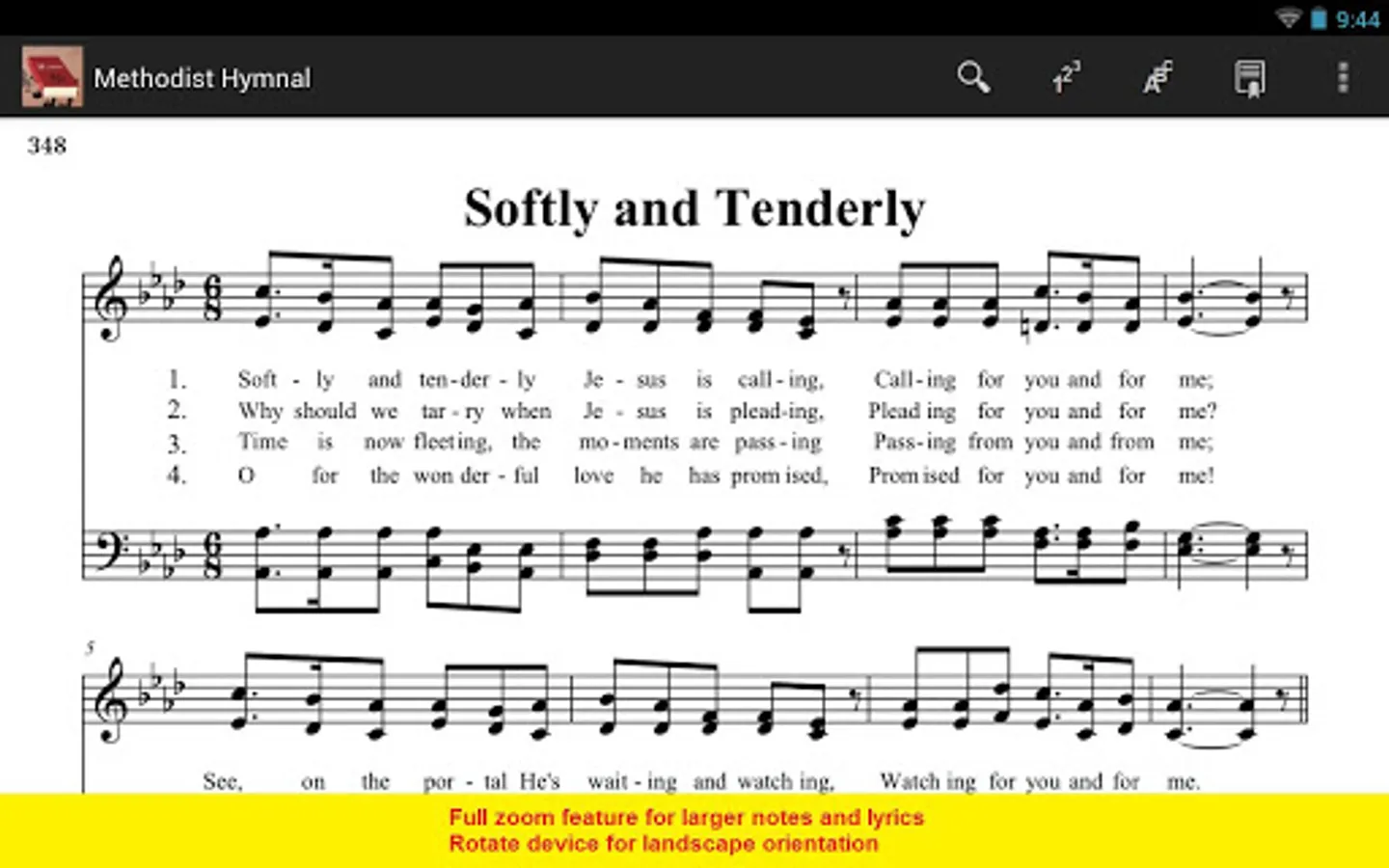 The user interface has a clean look with no ads, and very easy to use. You can quickly and easily find the hymn that you want either by selecting from the alphabetical index of hymn titles and first lines, the numerical index of hymn numbers based on the United Methodist Hymnal®, or your own bookmark list. There is a full featured bookmark list for you to add songs that you need for quick access. Use the search feature to quickly search for words in the title or first line, or just enter a hymn number to jump directly to that hymn. You can also swipe left or right to go to the next or previous song just like turning pages in the printed hymnal. The swipe turning sequence can either be in numerical hymn number order, alphabetical hymn title order, or bookmark list order. Zoom in for larger notes and texts both in portrait or landscape orientations.