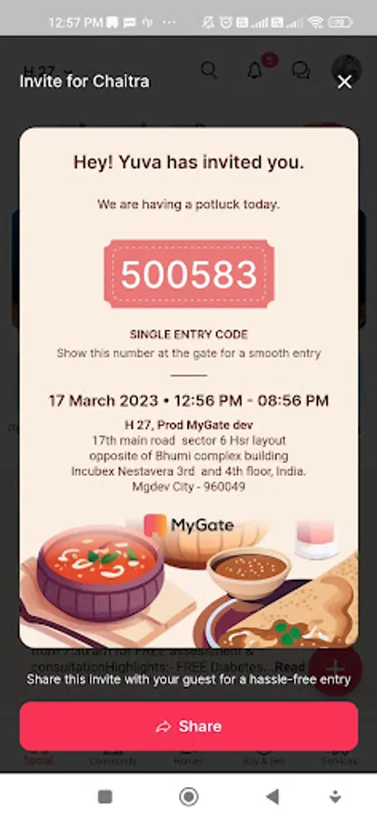 -Invite friends and family: You can send an invite through the app and guests receive a unique passcode with the invitation through SMS. Guests enter the passcode at your gate and get a seamless entry. This quick mechanism saves time and is 100% safe.