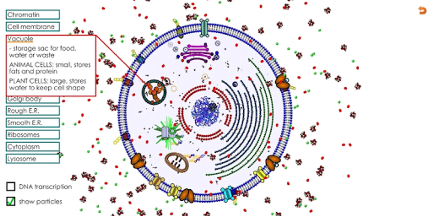 - "show particles" will show oxygen molecules (red), ions (green) and glucose molecules floating around the cell to demonstrate how they do, or don't get into/out of the cell