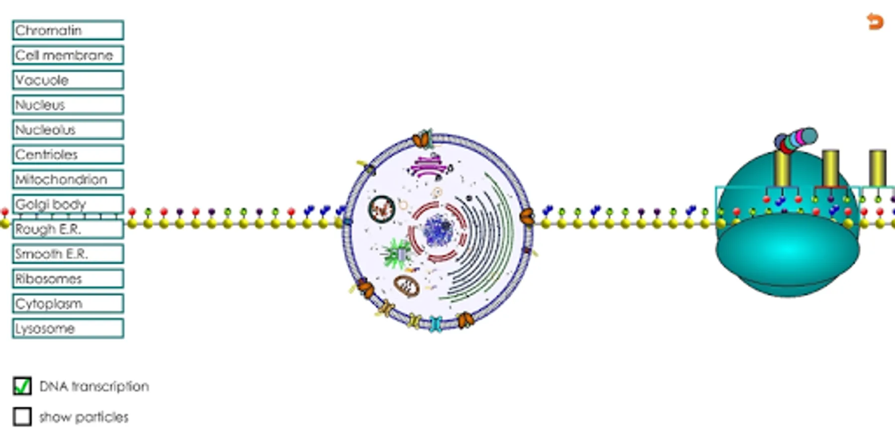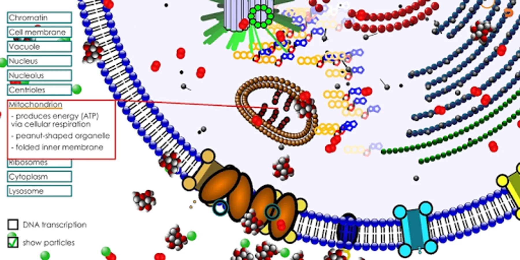 This app is designed for teaching/learning the basic organelles of an animal cell for middle and high school science. It also demonstrates passive, active and facilitated transport through the cell membrane, DNA transcription by ribosomes, and the interaction of lysosomes with vacuoles.