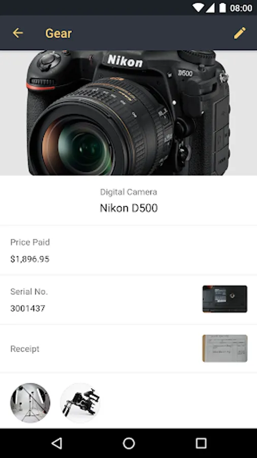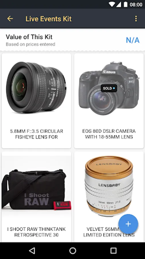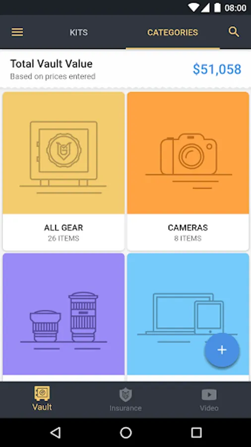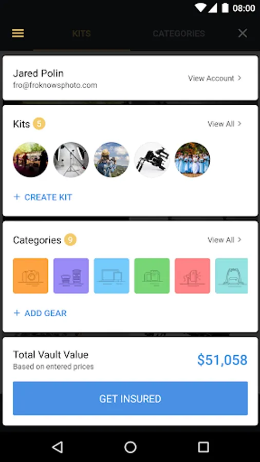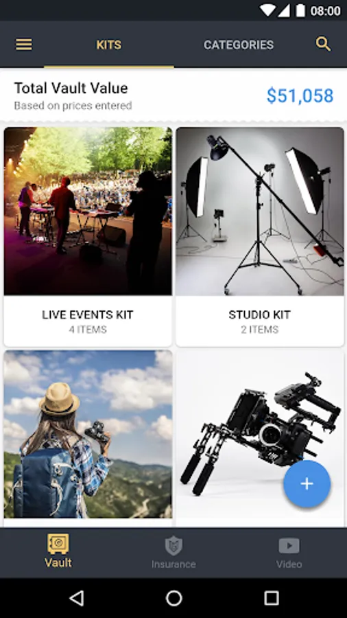We know you have a lot of gear, that’s why we help you organize it in a few unique and effective ways. First, each item can be saved into a specific category (i.e. Cameras, Lens, Computers, Data Storage, etc.). When you click on a category, you will see the total value of items based on the gear inside. Secondly, you can create custom kits of gear, like a wedding kit, travel kit, studio kit, video kit and more. This is a great way to know the value of gear you’re taking with you.