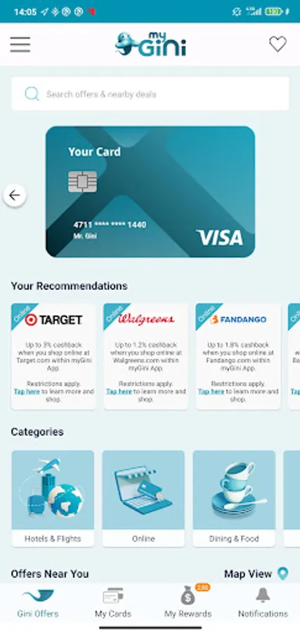 myGini is rewards and cashback app that gives you cash at local and nationwide merchants, and hotels all for free. The app will show the offers within your 20-mile radius automatically.
