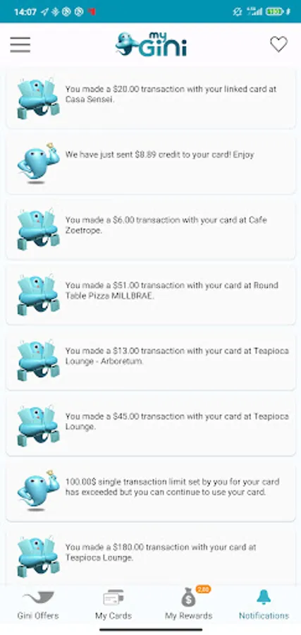Add your Visa and Mastercard credit and debit cards to myGini and use them as you normally do. You will get cash back automatically at thousands of restaurants and merchants with myGini when you shop at any of those participating retailers.