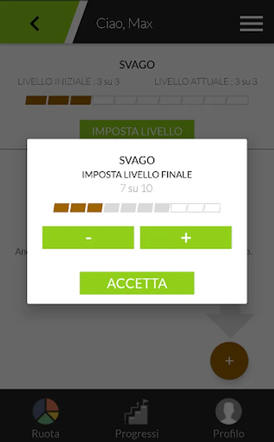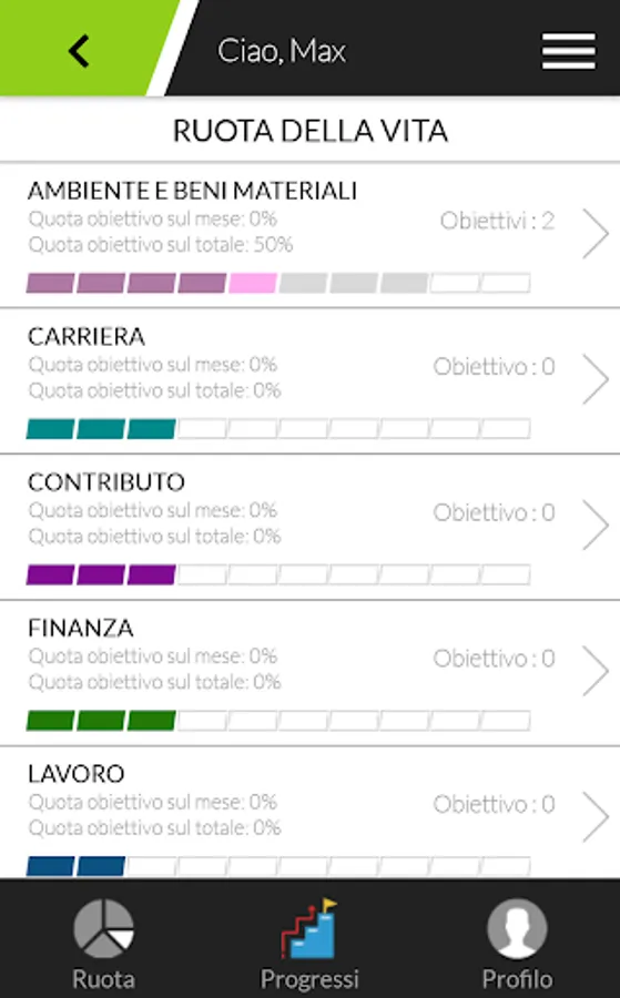 3. It allows you to draw an interactive Wheel of Life that starting from your initial state will update with your progress in the 8 sectors: Career and Personal Growth, Relationships, Physical and Mental Health, Finance, Leisure, Work, Environment and Material Goods and Contribution.