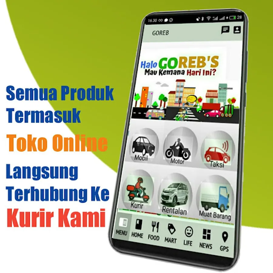 - GOREB has also been and is able to present the best applications of all time that are not in other competing applications where GOREB is able to combine the Motorcycle, Online, Delivery, Car, Taxi application in one application with the Online Store "FOOD & TOKOKU" which is directly connected to the Courier, where the seller of the product no longer needs to bother thinking about the introductory product delivery courier, but just focus on the readiness of the product.