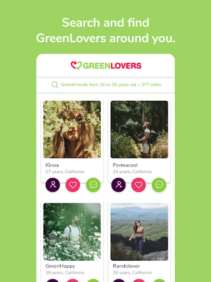 The search engine allows you to define precise criteria to find your GreenLover or new GreenFriends! You can easily meet other green singles or just make new friends.