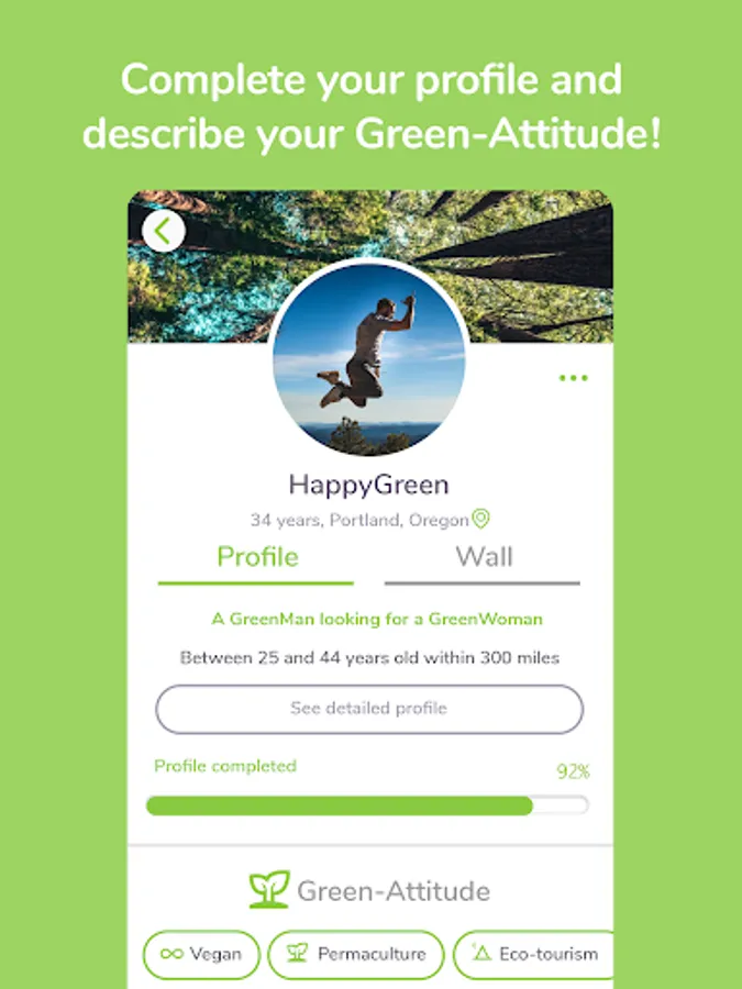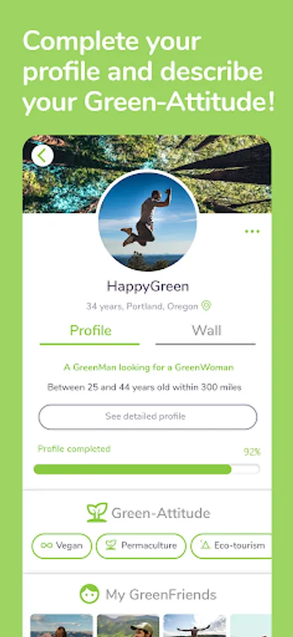 Your profile has several sections to introduce yourself in detail, upload photos and define your Green-Attitude.