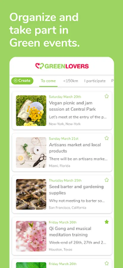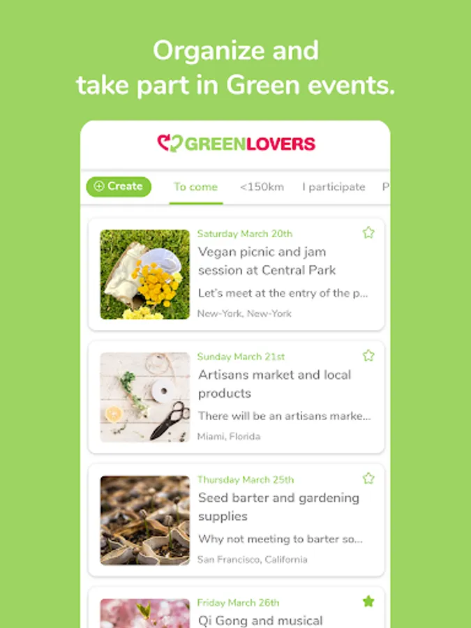 You can organize and participate in the events offered by other GreenLovers. Nothing better than a group activity to get together and meet new GreenFriends!