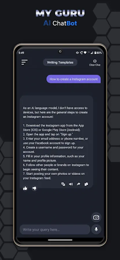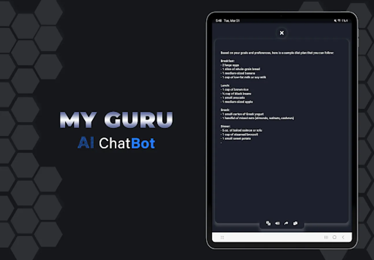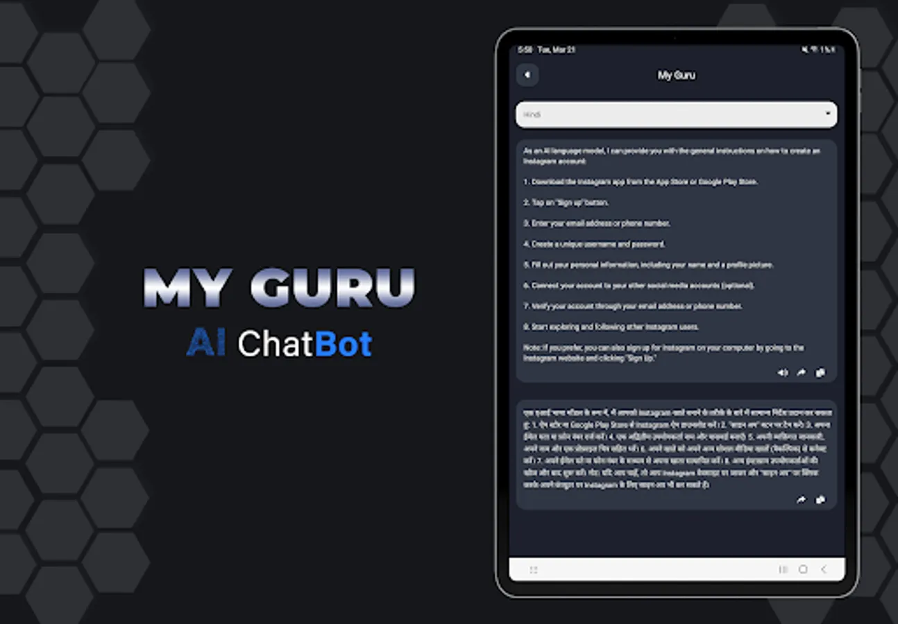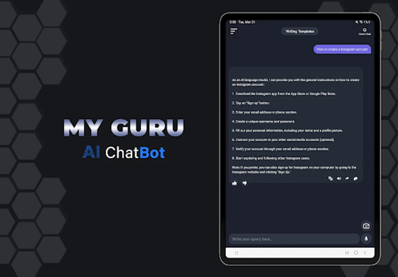 Introducing My Guru: GPT4 AI ChatBot the ultimate personal assistant and AI chatbot. With My Guru, you can get instant help and answers to any question, anytime, anywhere. Simply type or speak your request and receive a quick and accurate response from our advanced artificial intelligence.