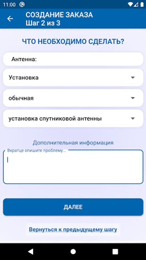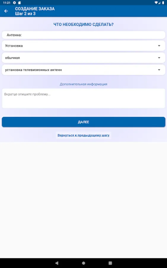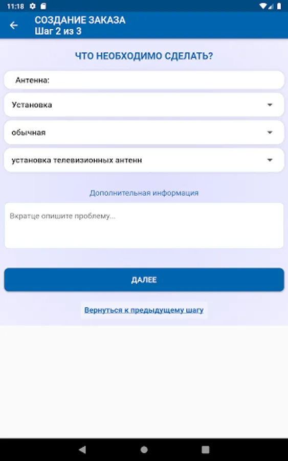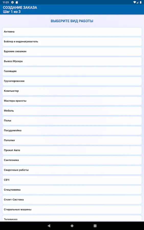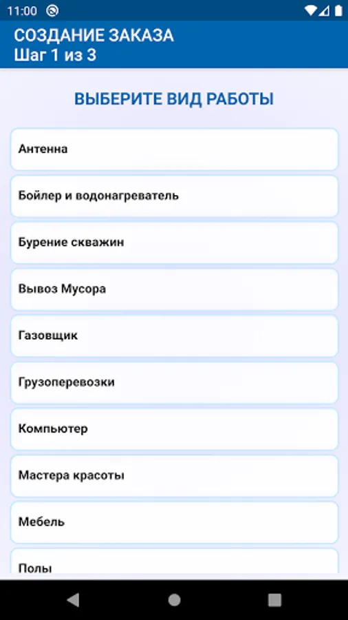1. Selection of the category and type of work (in the absence of a suitable type of work, you can briefly describe the essence of the problem).