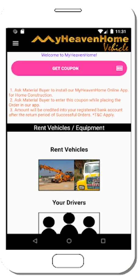 Just download MyHeavenHome's Vehicle app. and details like vehicle’s / equipment’s rental amount, driver’s / operator’s wages, hours of work etc. You will get orders wherever you're and whatever you're doing.
