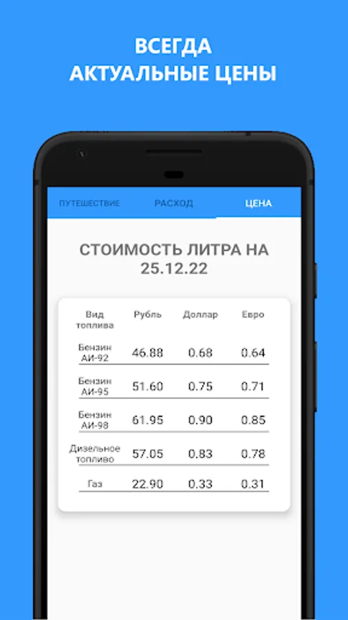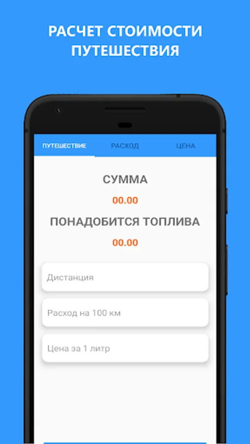 The application helps to determine the fuel consumption per 100 km and helps to calculate the cost of fuel needed for the trip.