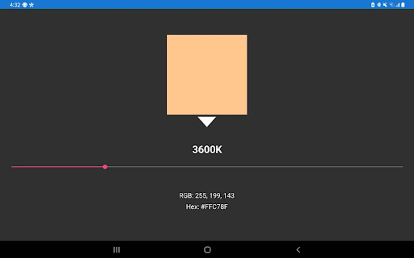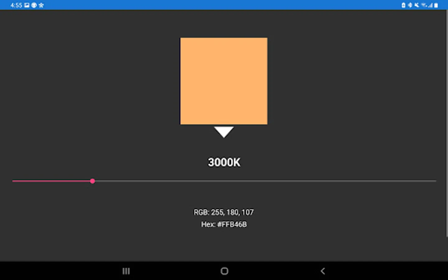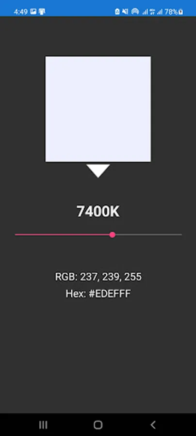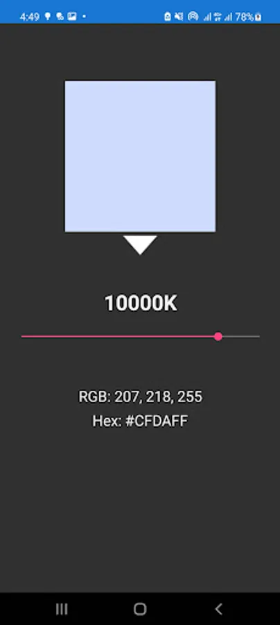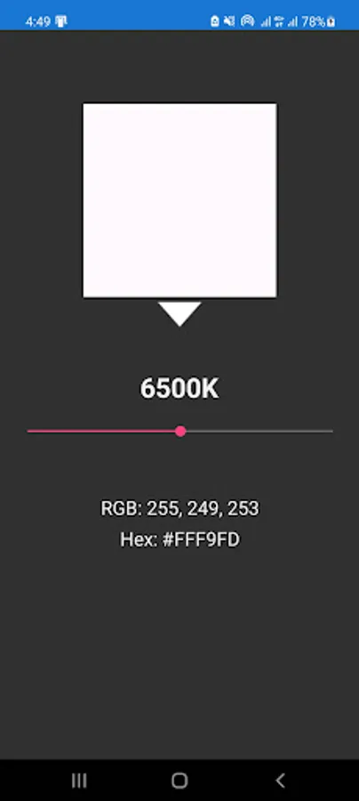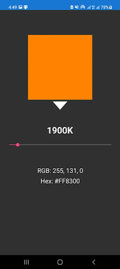 Kelvin Color Temperature App shows the color and its corresponding value in RGB and Hex, by using a slider.