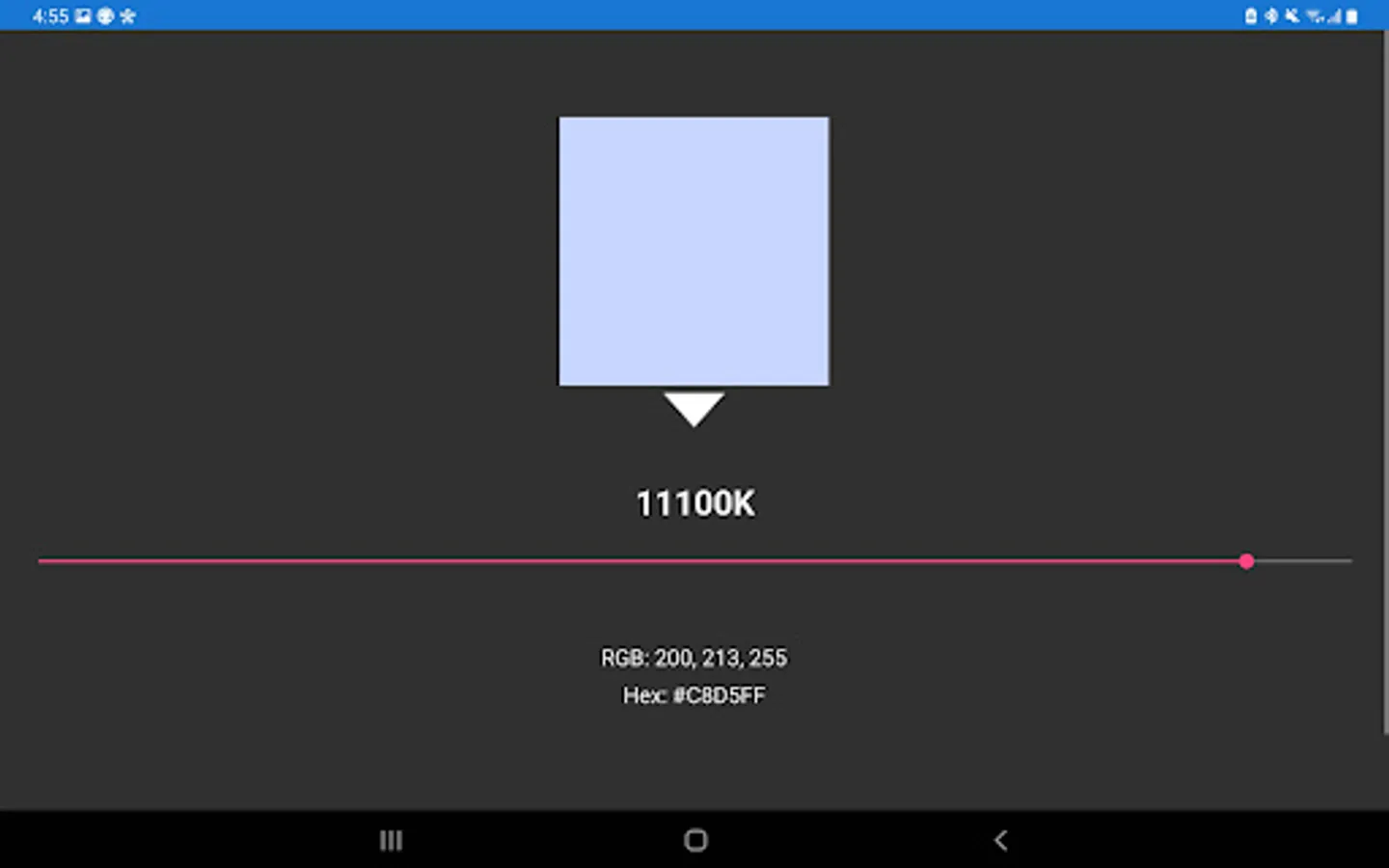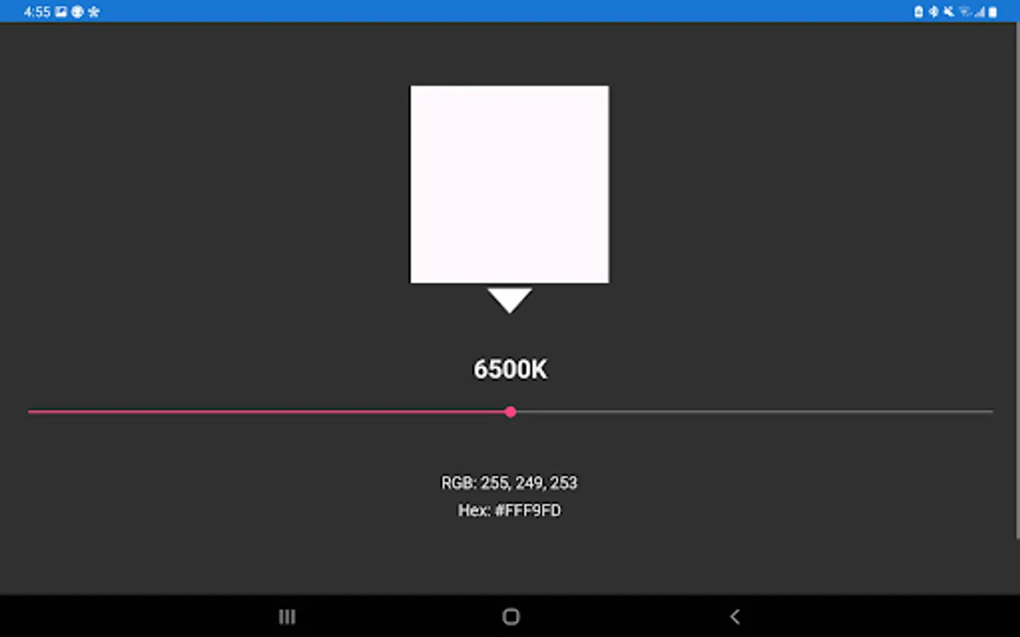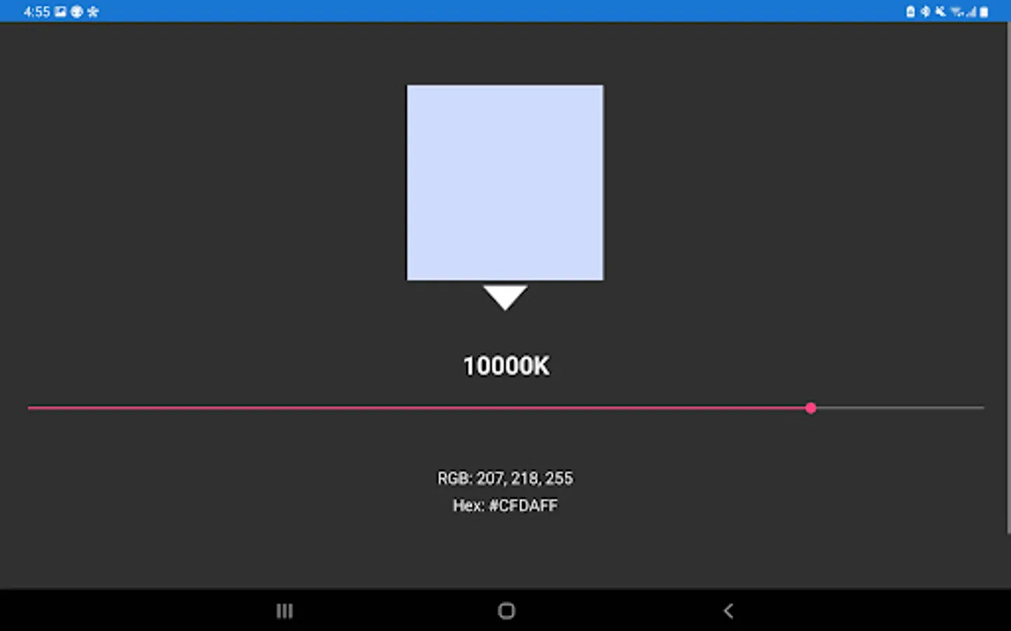 Kelvin Color Temperature App shows the color and its corresponding value in RGB and Hex, by using a slider.
