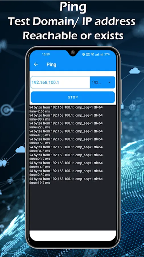 A ping test is one of the most common features used in the networking world to check the reachability of network devices everyone uses a ping test so now you can check the ping status with the help of our app ping test. Now you can ping any IP address or domain using the ICMP protocol. With the help of a ping test, you can easily analyze the internet connection