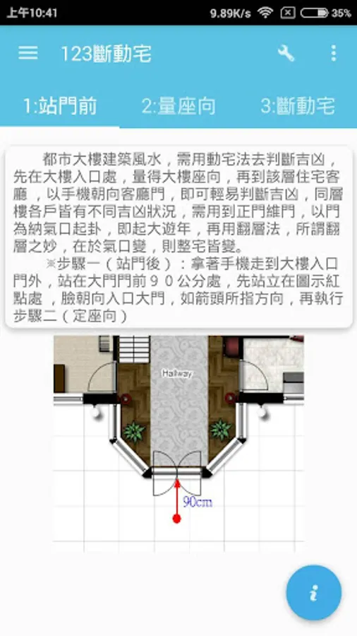 步驟三:找吉位-再到屋中的客廳中間,對著房屋門口,即可判斷出吉凶