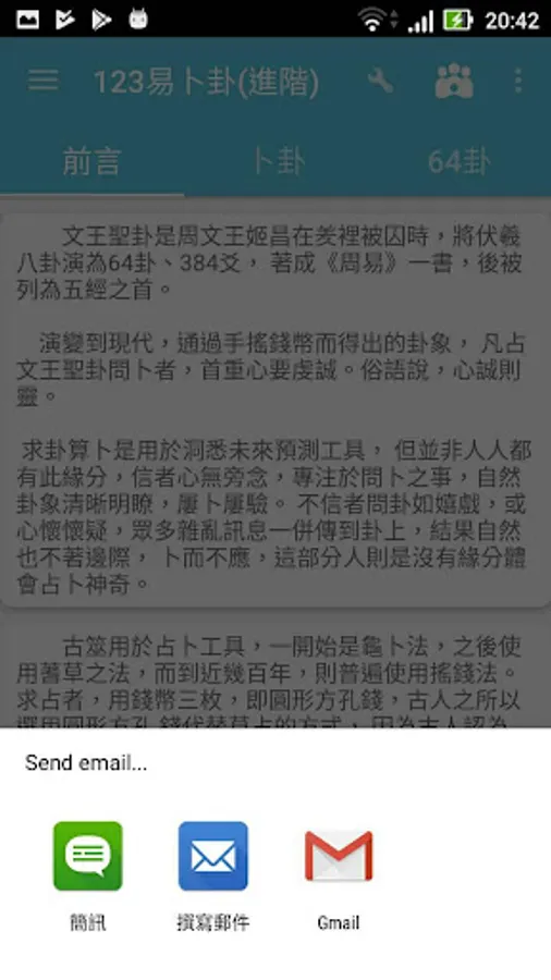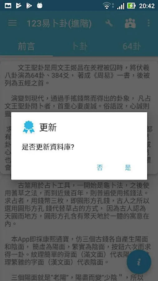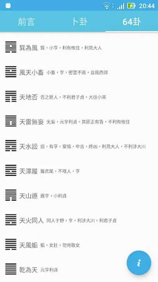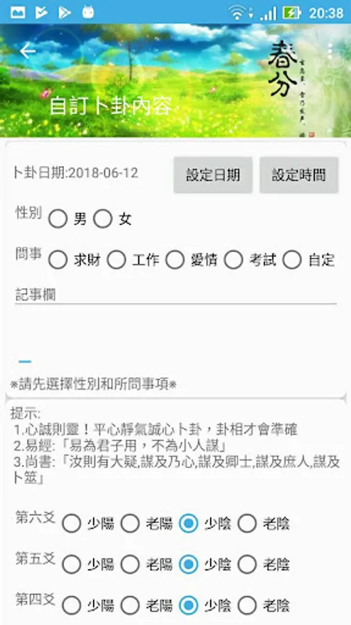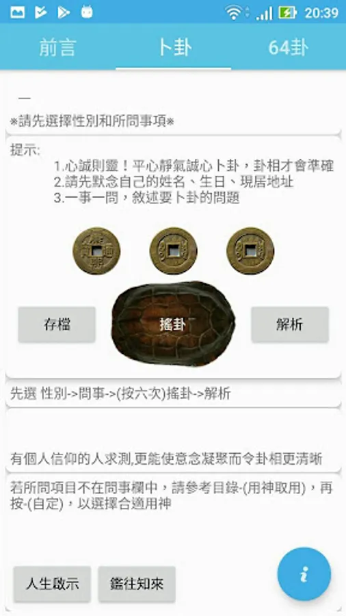 本軟體APP建議的金錢卦卜卦方式,只能做為行事參考,用來逐一檢視自己的工具,最重要的還是個人要努力,卜卦只是為參考,不可做為決策依據,本軟體並不擔保有關資料之任何不確或遺漏,而引致之任何損失或損害承擔任何責任
