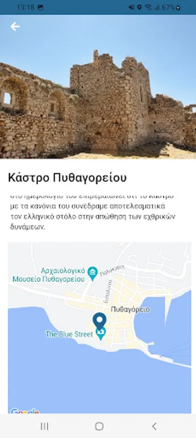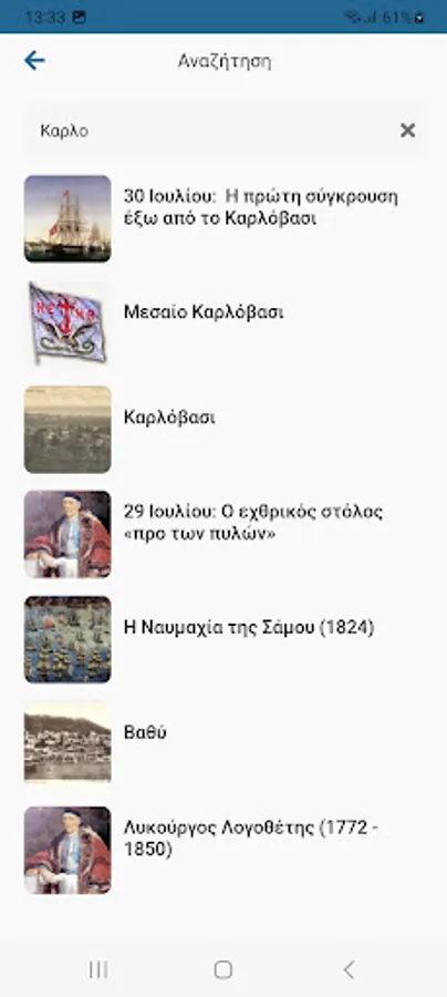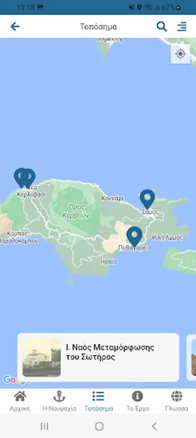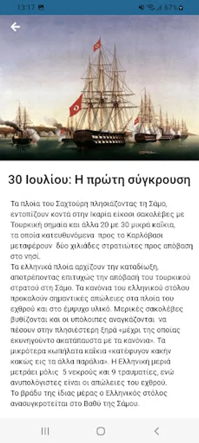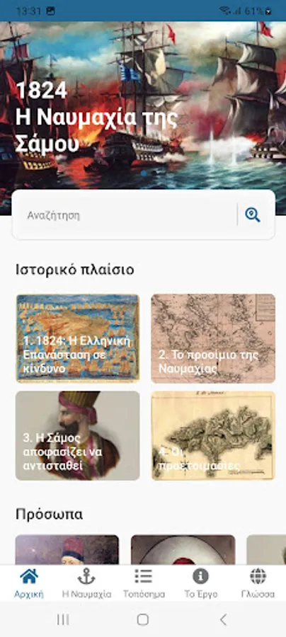 Navigation application containing information about the Historic Naval Battle of Samos in 1824 from both a historical and cultural perspective. Through the application, the visitor/user is given the possibility to digitally browse through that historical period and get to know the events and the persons who starred in them. Photographic and visual material, historical data, and the exact location of each location related to the Battle of the Seas are provided through an easy-to-use navigation environment.