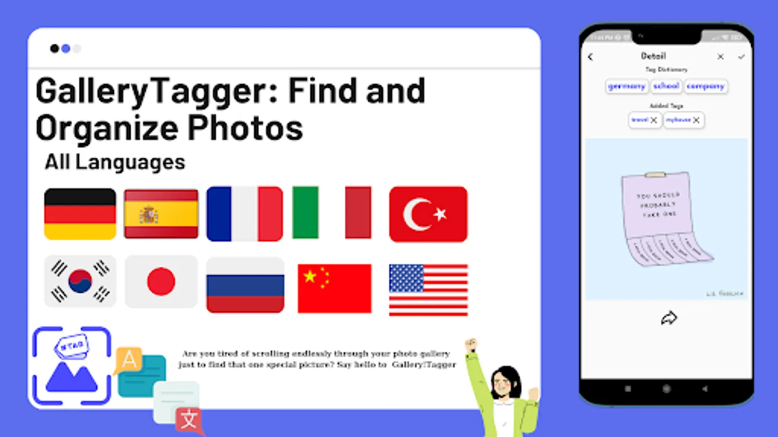 With Gallery Tagger, you can quickly find photos of your friends and family, favorite places, pets, and more. You can even use multiple keywords to narrow down your search and find exactly what you're looking for. And if you have a lot of photos, don't worry – our app is lightning-fast and can handle even the largest collections.