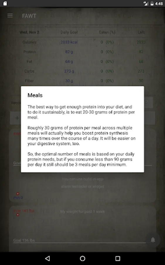 * set custom goals for Calories, Macro-nutrients, Fiber and Water (if recommended does not fit to you);