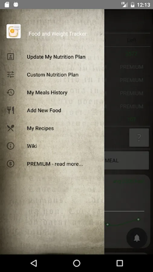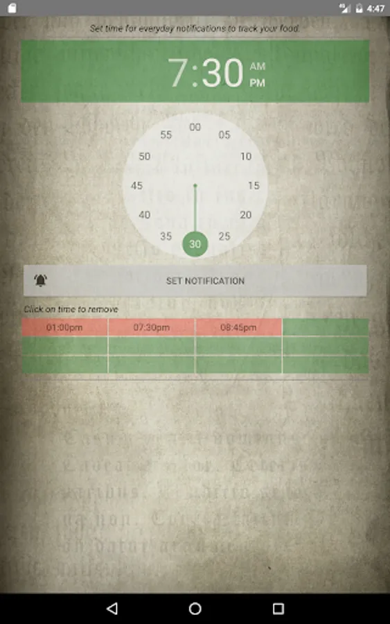 * set everyday notification reminders to make record or to have a meal (up to 12 reminders per day);