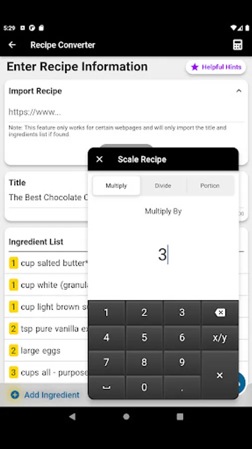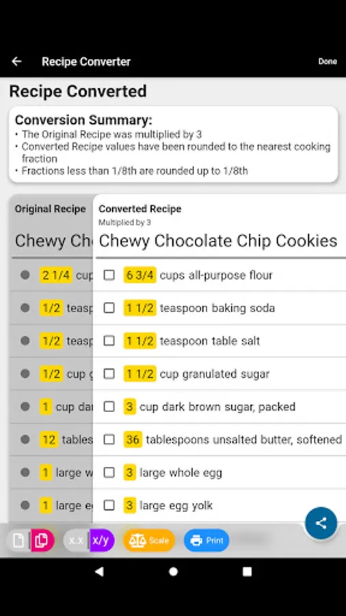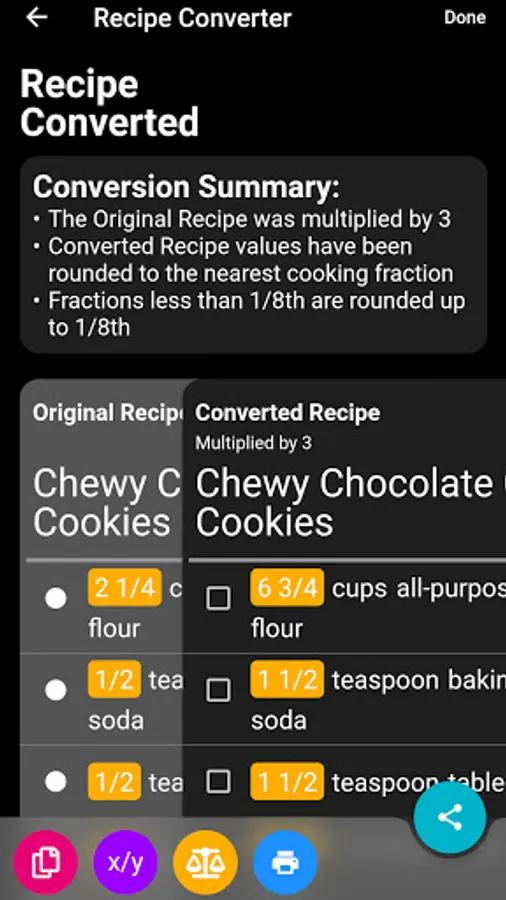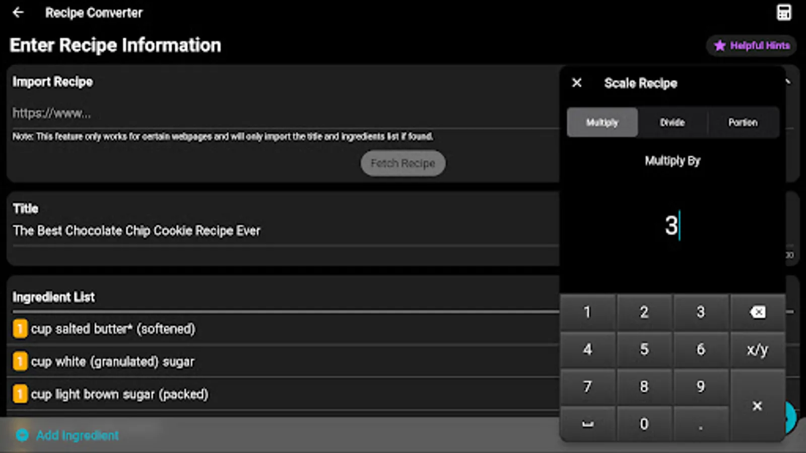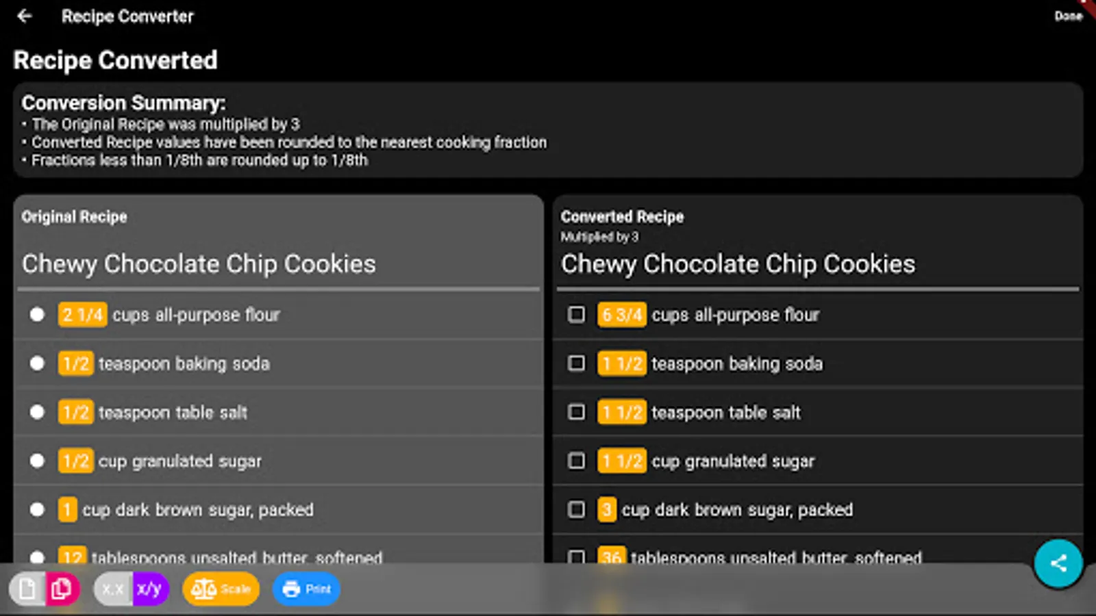 The Kitchen Calculator app by MyKitchenCalculator.com is a tool that includes a recipe converter (recipe multiplier), cooking references, and several conversion calculators that help you easily convert between the most common measuring units used in cooking and baking.