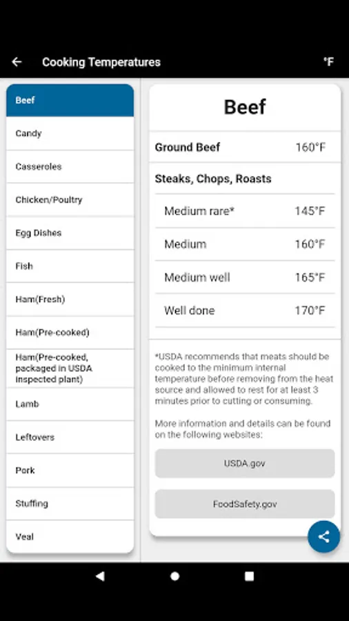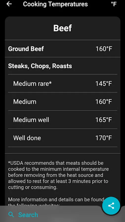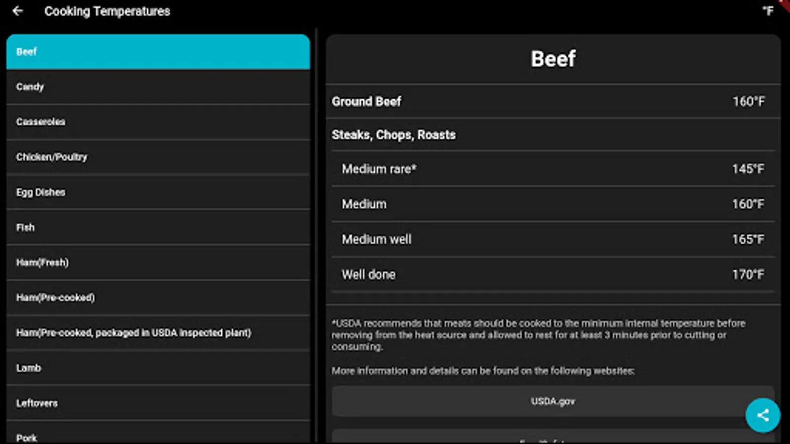 Easily look up the USDA recommended cooking temperatures of most dishes such as meats, eggs, and casseroles. You can also look up candy cooking temperatures that tell you the stages of sugar at each temperature range.