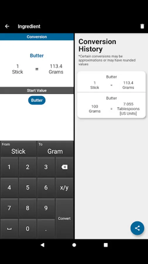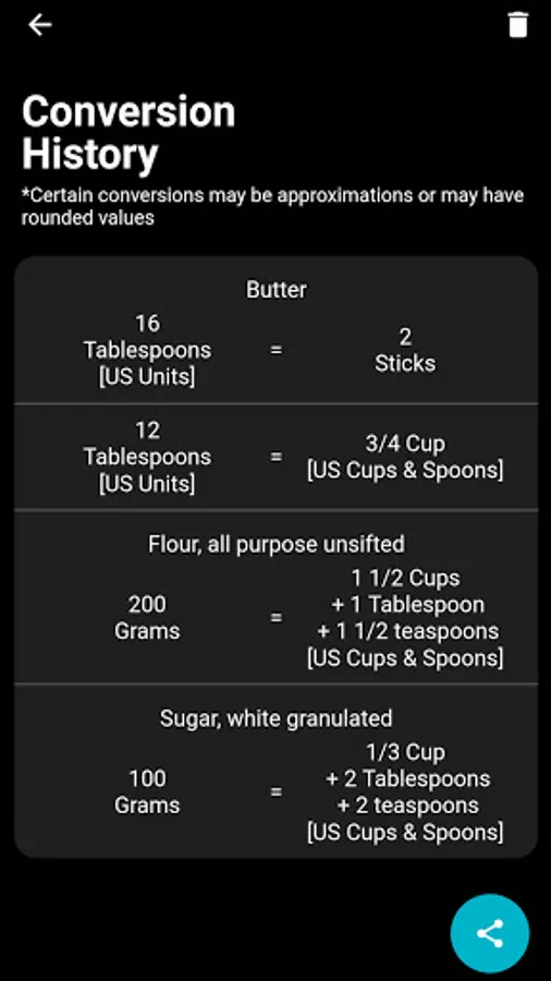 Easily share your conversions with others if your device has compatible share action apps such as certain email or text messaging apps.