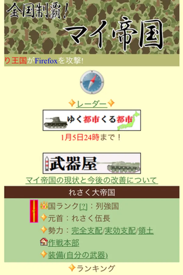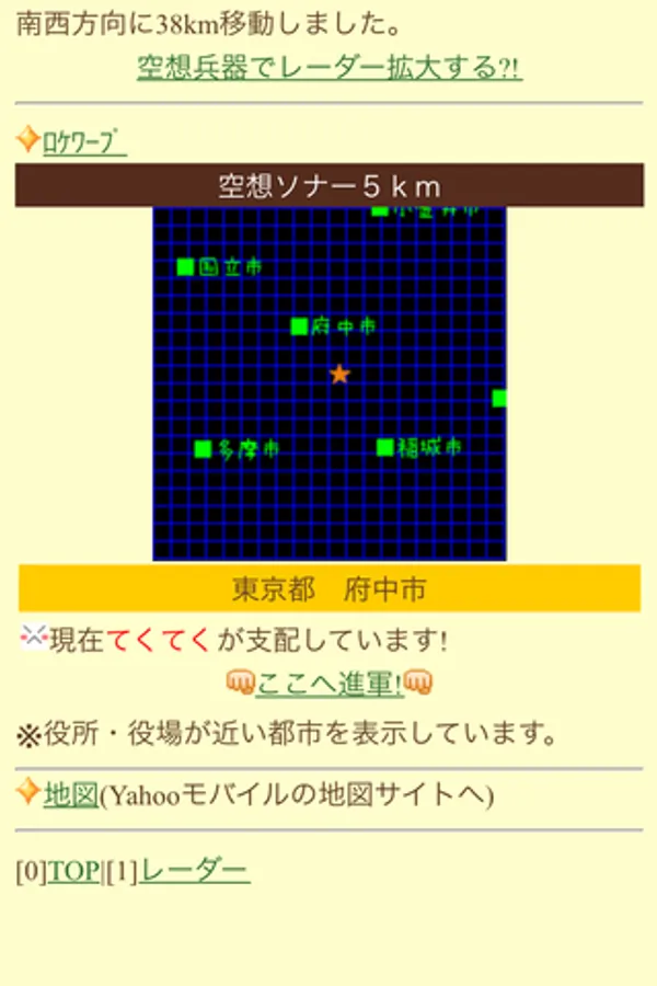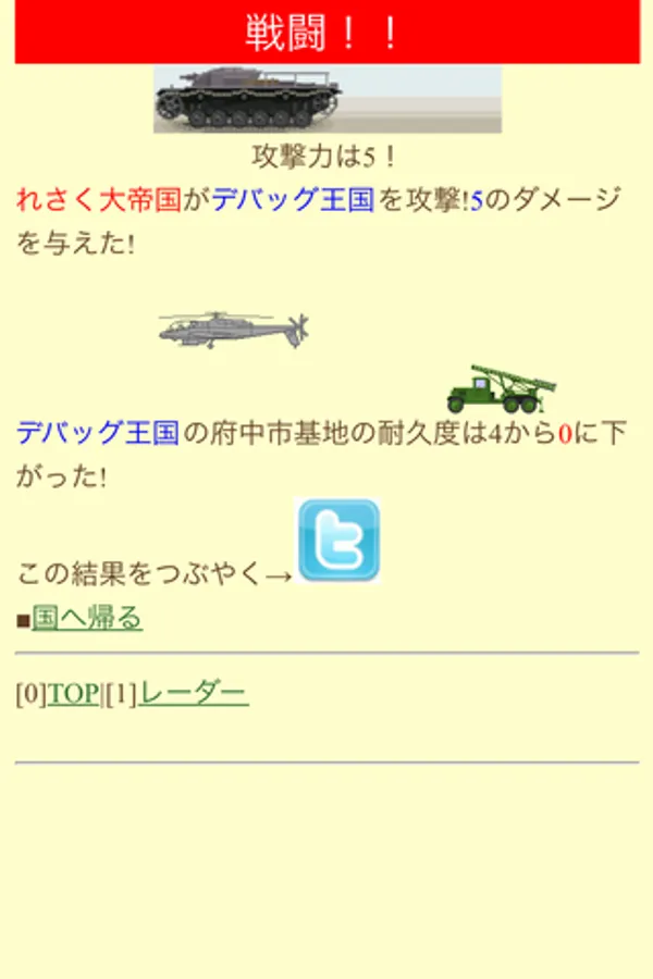 支配した「領土」にこまめにアクセスすると国力が上がります。これが「統治」です。1回「統治」すると基地の「耐久力」が1上がります。原則として統治は1時間に1回だけ可能です。が、それを破る空想兵器(ry