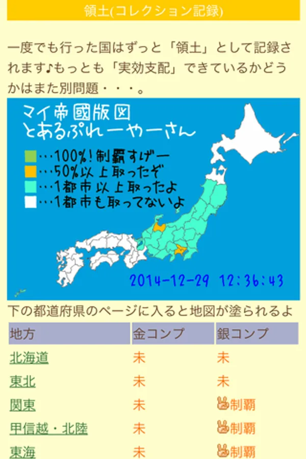 全国制覇!マイ帝国では日本の市区町村約2000をスタンプラリーのように「領土」にして集めることができます。その市の「支配者」や戦闘は、アナタのスタンプラリーとしての記録には一切影響しません。安心して全国制覇を目指しましょう。