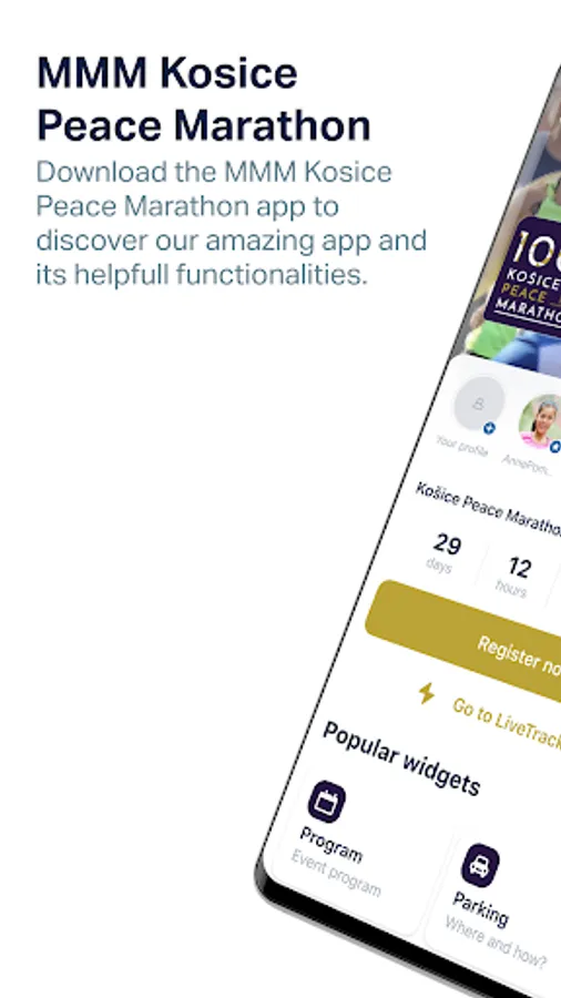 The Kosice Peace Marathon (MMM) mobile app is the most complete app for the ultimate event experience. It features live tracking of all participants (without using their phones), social media integration, interactive course maps, selfies and all information you need to know about the MMM.