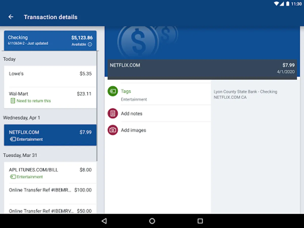 Add Tags, Notes, Images & Geo-Information: By enhancing transactions with custom tags, notes or photos of a receipt or check, you have the ability to stay organized and find exactly what you’re looking for when searching through your finances.