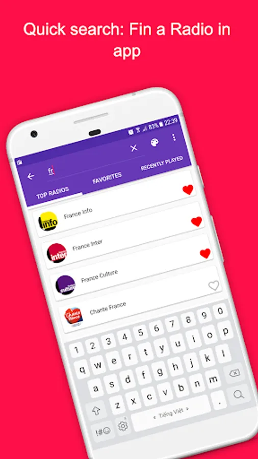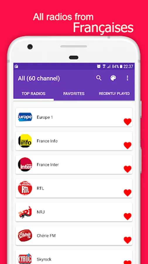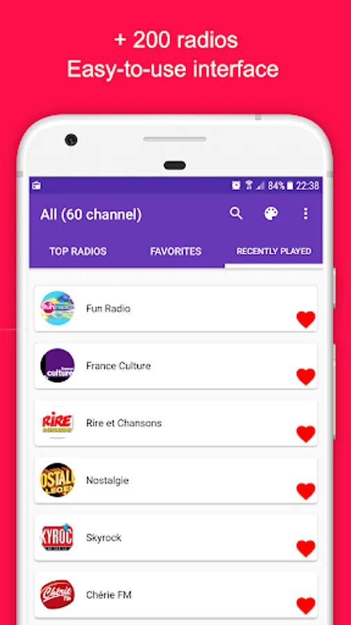 Radio France is the most favourite application all over the world. With the abundant radio stations system(about 100 stations such as new,sports and music ...) you can choose listen your favourites radio stations as you want. It work in high speed with any network(3g/4g/wifi)