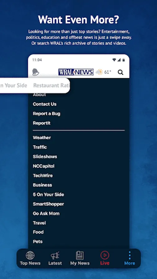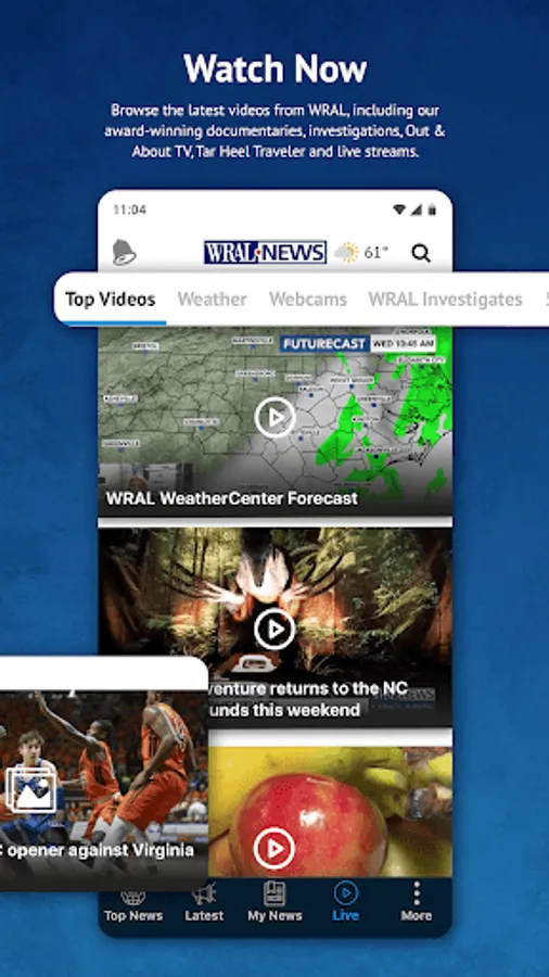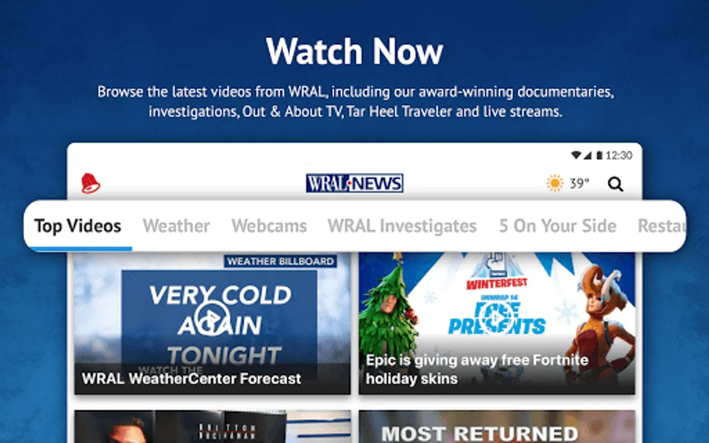• Use "Watch" to browse the live streams and the latest videos from WRAL, including our award-winning documentaries, investigations, webcams across the state, Out & About TV and Tar Heel Traveler.