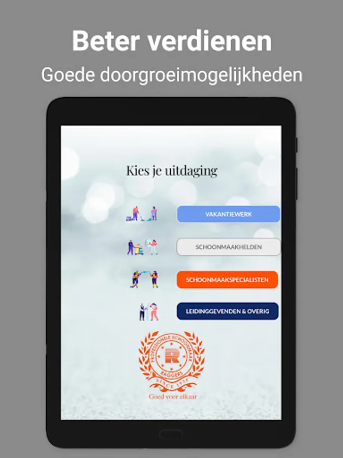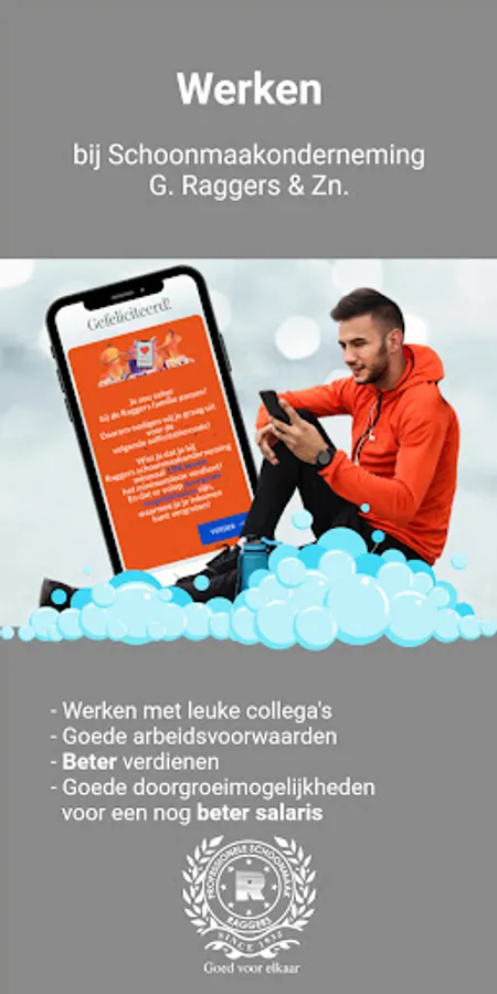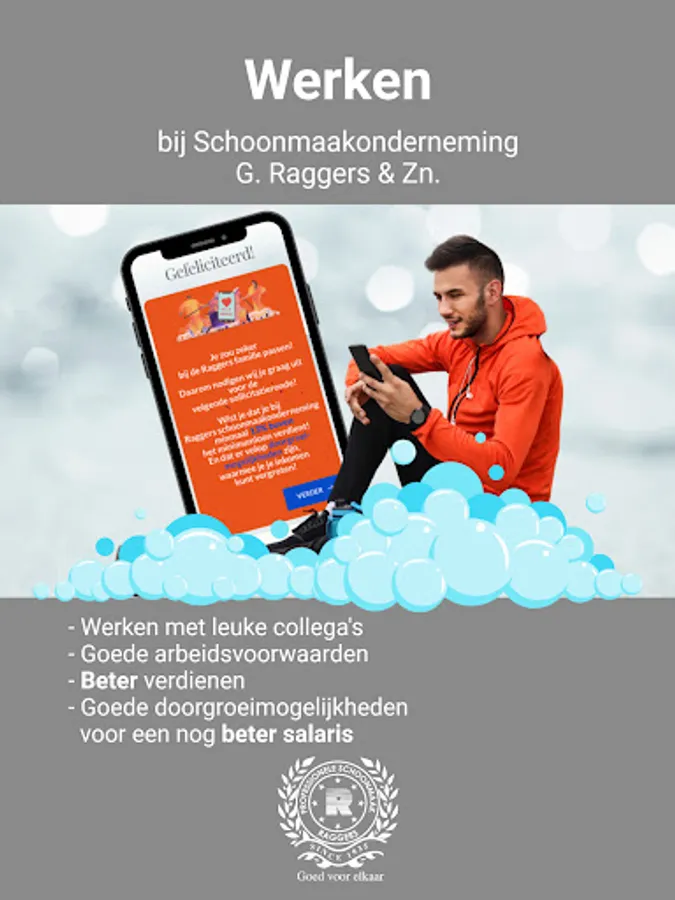 Apply directly for the best jobs at the best-known cleaning company G. Raggers & Zn. Always pay above the minimum wage. Various positions, including part-time work and holiday work. Hear immediately whether you proceed to the next round.