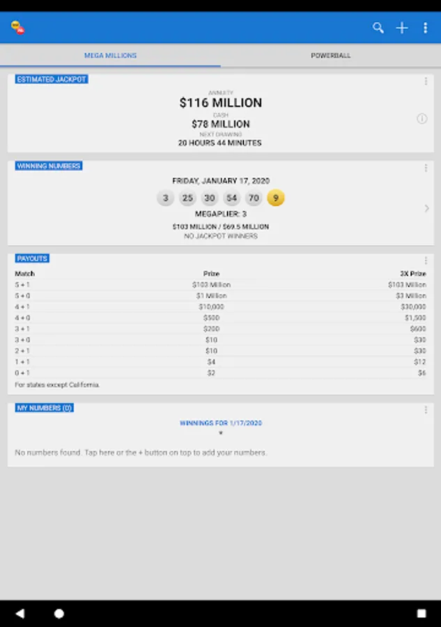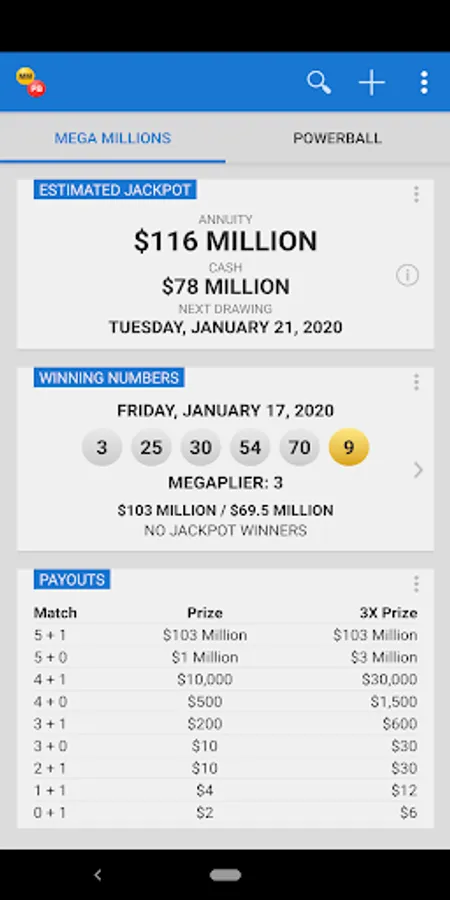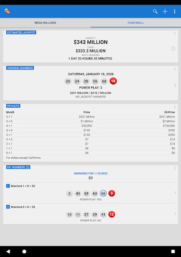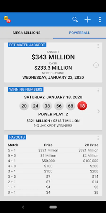 Mega Millions and Powerball are the two biggest lottery jackpot games in the US. The Mega Millions & Powerball app provides the latest jackpot information and drawing results. If you need state lottery games, please download our free Lotto Results app.