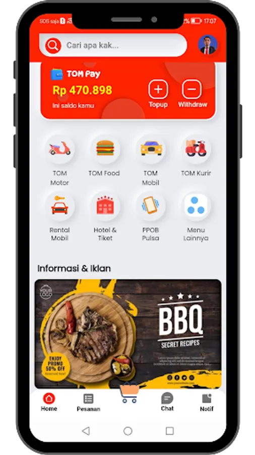 TOM also provides E-Commerce, Laundry, Car Rental and Service features and various interesting features including Ticketing and PPOB.