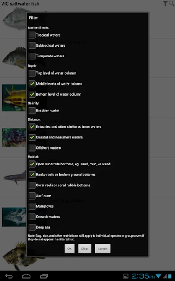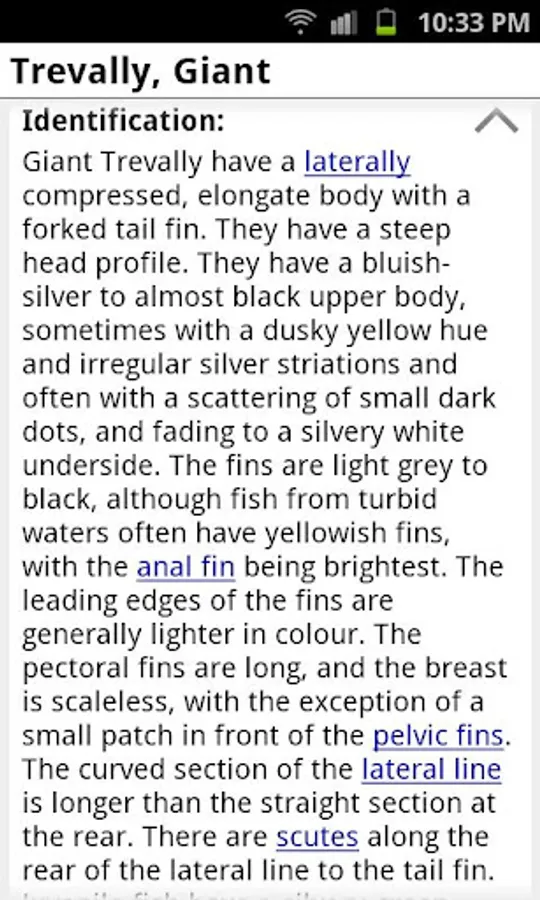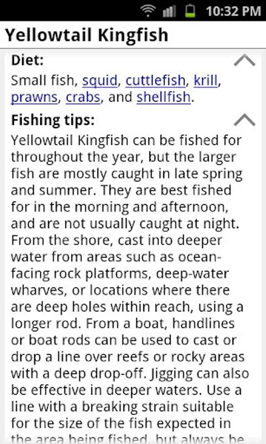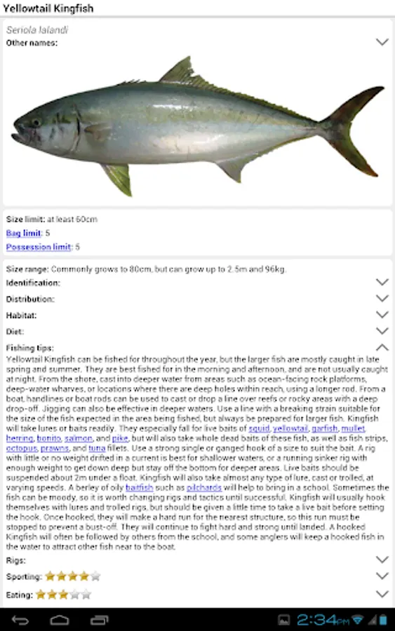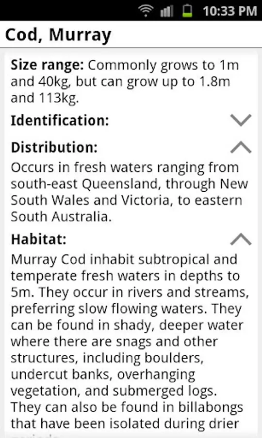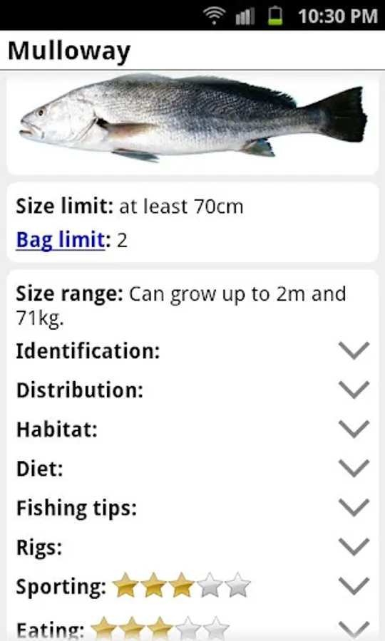 My Fishing Mate Pro is the essential app for recreational fishing, anywhere in Australia. It has all of the size, bag, and boat limits, open and closed seasons, and any other applicable rules for each species of fish and invertebrate, both freshwater and saltwater. With listings and images for over 650 species, you can be sure to identify that fish you have just caught! There is also detailed additional information for many species including size range, description, distribution, habitat, life cycle, diet, sport and eating qualities, and most importantly - fishing tips and rigs! Every state is included - NSW, ACT, VIC, QLD, SA, WA, TAS and NT. Every species that has any fishing regulations is here, (nearly) all with photos, so you can be confident that you are fishing within the state's laws. You can directly search for a fish from the scroll list, or swipe from fish to fish to quickly find what you've just caught. The app is designed with a crisp and clean interface to maximise screen real estate so that you can read it easily in outdoor conditions, and all of the info is available even in offline mode, so you can use it anywhere where the fish are! Happy fishing!