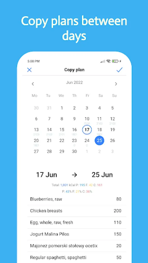 * Copy plan - Most people eat the same food from day to day. Copy-pasting will make calorie tracking even easier