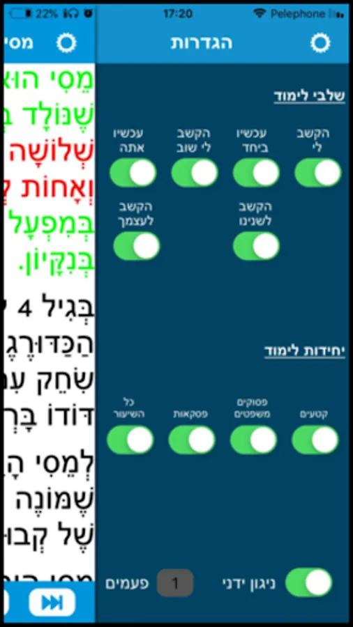 The application enables self-study of the Torah reading, the Haftarah and the blessings required for Bar Mitzvah boys. The application contains all the relevant aliot and all the haftarot in the Israeli or Sephardic version. This is without a doubt the easiest, cheapest and fastest way to prepare for the Aliah to the Torah.